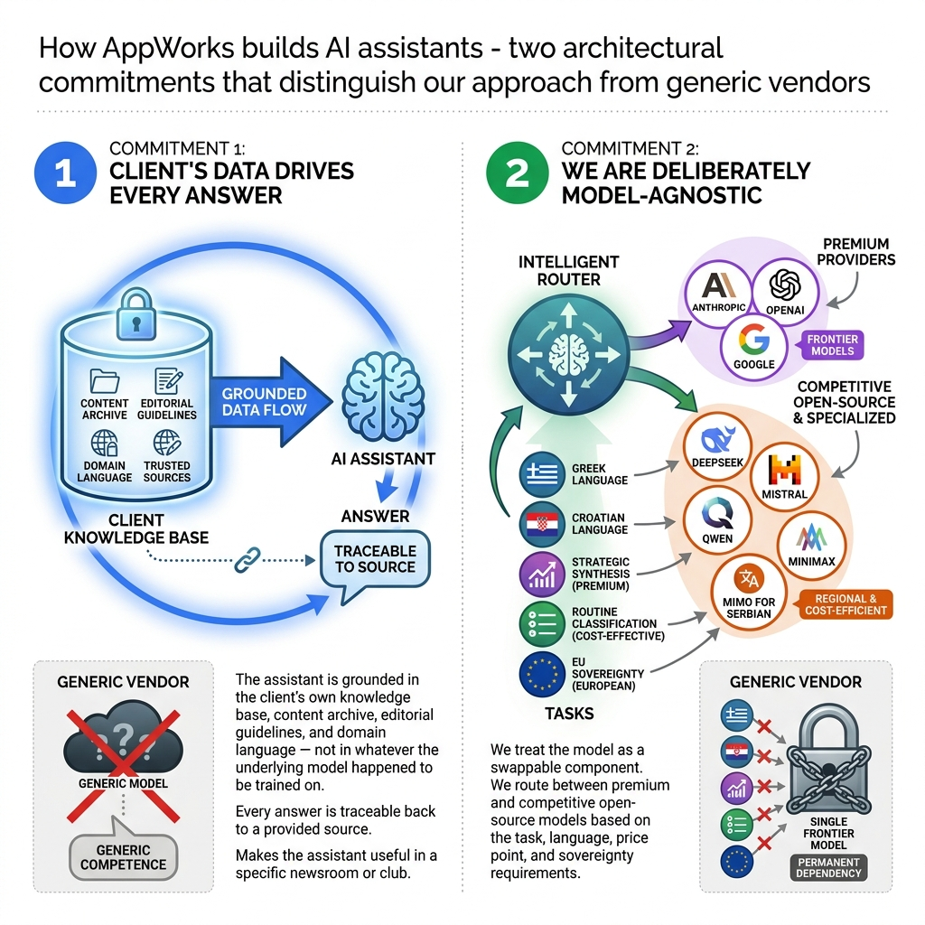 The nervous system is what actually determines whether an assistant is useful in your specific organisation. The gateway, the data pipeline, the routing logic and the governance layer bridge the gap between a model trained on the open internet and a tool that knows your editorial style guide, your ten-year archive of match reports and the morphological rules of a regional language that most frontier models handle poorly.