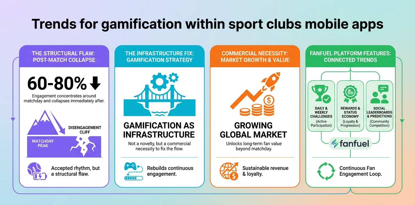 The commercial consequence is concrete. Sponsors paying for digital exposure are receiving impressions without outcomes. Merchandise sits unsold because the app isn't surfacing it at the moments fans are most receptive. And first-party fan data simply isn't being generated on non-matchday days because there's no interaction to generate it from. Gamification addresses this at the structural level - creating behavioral reasons to open the app, interact, and transact regardless of whether there's a match.